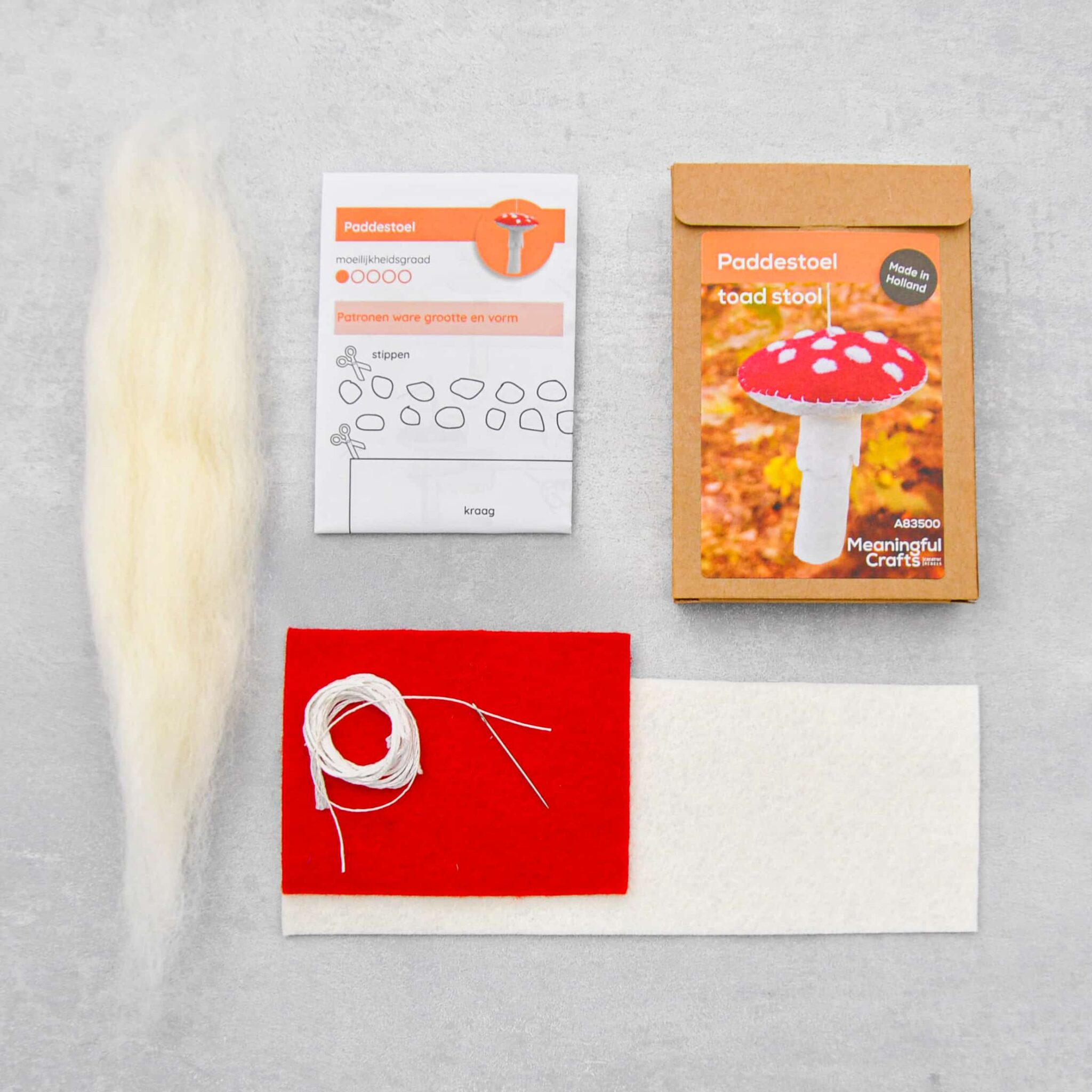 Creëer je eigen magische herfstdecoratie met het Zelfmaakpakket Paddenstoel van Meaningful Crafts. Dit pakket bevat alles wat je nodig hebt om een schattige paddestoel te maken van 100% wollen vilt (TrueFelt) en vulwol. Het project is perfect voor beginners, met eenvoudige stapsgewijze instructies die het plezierig en gemakkelijk maken om te maken.